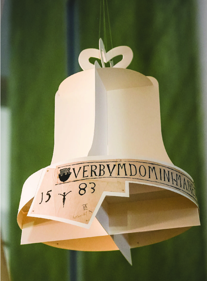 Die Glocken im Turm waren schwer zu fotografieren. Daher nutzte man die Technik der Frottage und dokumentierte durch »Abreibung« die Inschriften und Namen der Glockengießer oder Auftraggeber. Etliche Schriftbänder werden heute in den Sammlungen des Landesamtes aufbewahrt. Die Kottmarsdorfer Glockenschrift (hier auf einer Papierglocke inszeniert) ist eine davon. Da viele Glocken in den beiden Weltkriegen eingeschmolzen und somit verloren gingen, sind die Frottagen oft die letzten Zeugnisse dieser Klangdenkmale. Die Kottmarsdorfer Glocke ereilte jedoch ein anderes Schicksal: Sie zersprang Weihnachten 1895.